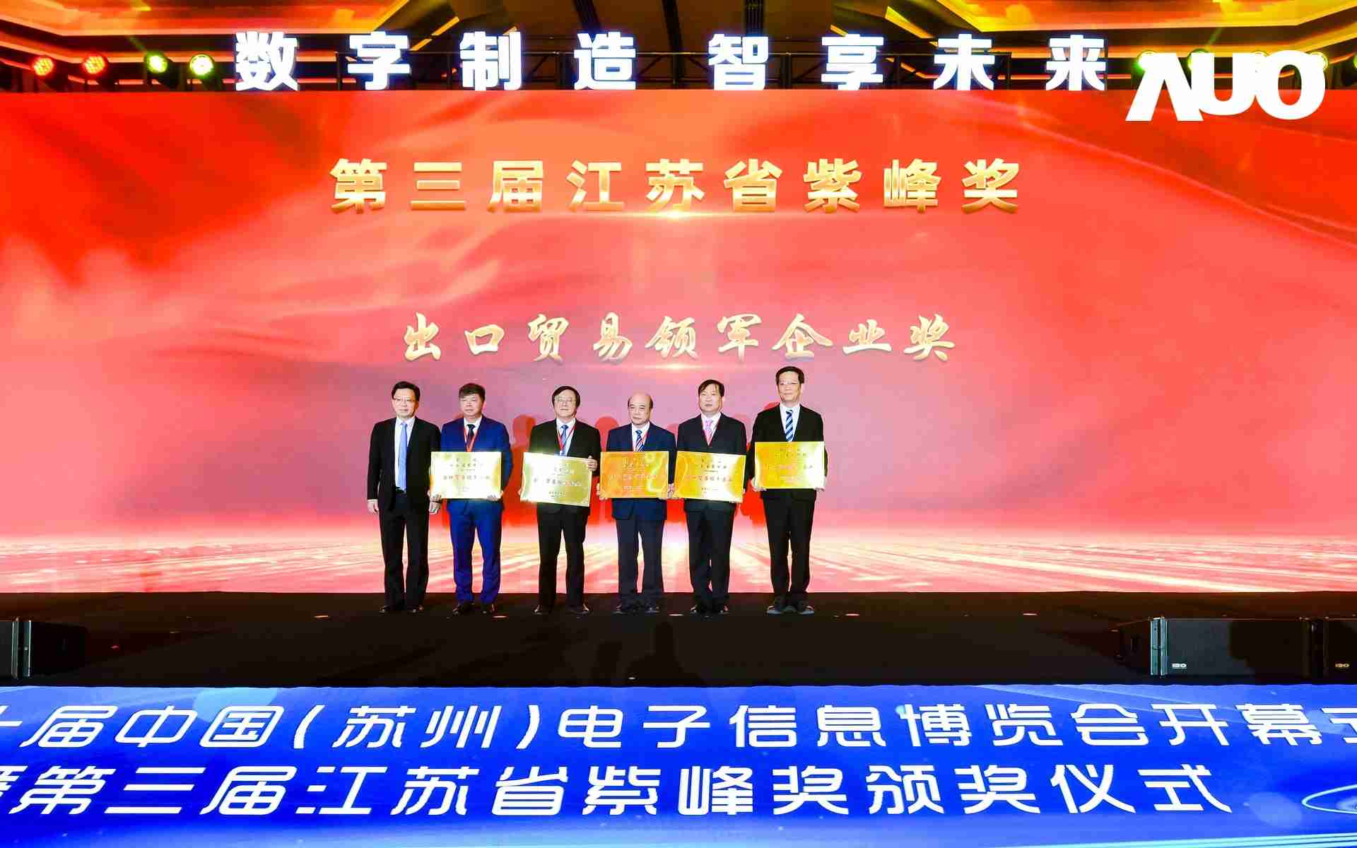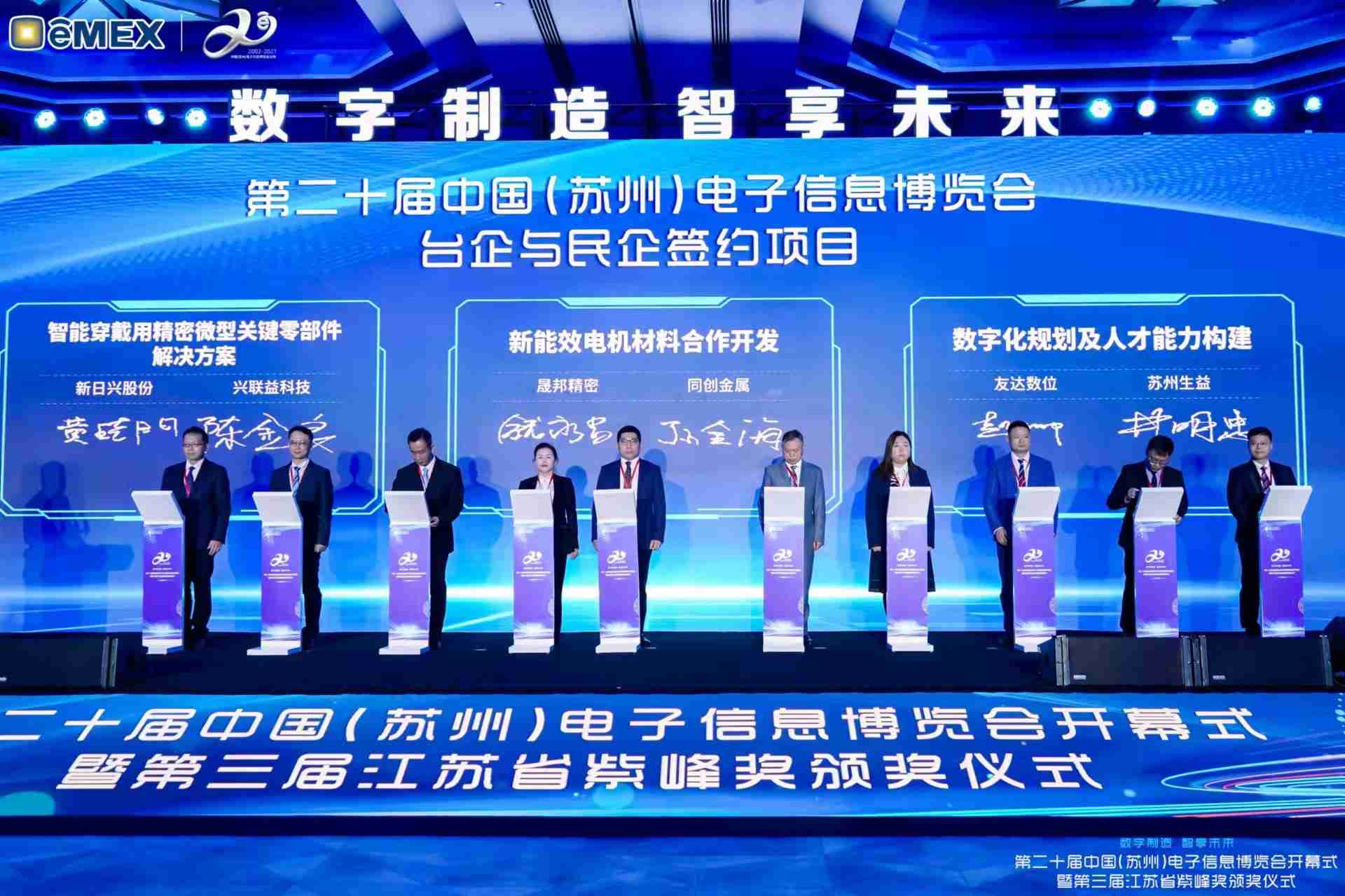 电博会开幕式当天也是第三届江苏省紫峰奖颁奖仪式,,省台办、、、、工信厅、、商务厅、、、、苏州市相关领导均出席并颁奖。。该奖项为表彰对江苏高质量发展做出积极贡献的在苏企业,,由江苏省政府专门设立。。糖果派对光电 (苏州) 总经理郭振明代表上台领奖,,,,这也是糖果派对苏州连续三次蝉联紫峰奖 出口贸易领军企业奖。。。糖果派对数位总经理赵丽娜女士,,,也参与本次开幕式,,,上台为本地化赋能签署战略合作协议,,将优质服务资源集合、、、、下沉到更多细分行业,,为更多地区的制造企业提供数字化转型服务。。。